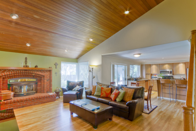 with hot tub. Impressive and efficient fireplace is the focal point in the