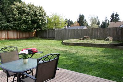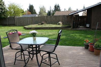 Huge lot with deck, raised garden beds, and outbuilding for shop or storage.