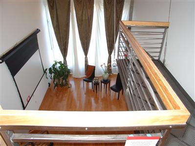 entry. Oak floors, Steel Sculptor designed Catwalk Balcony off Loft